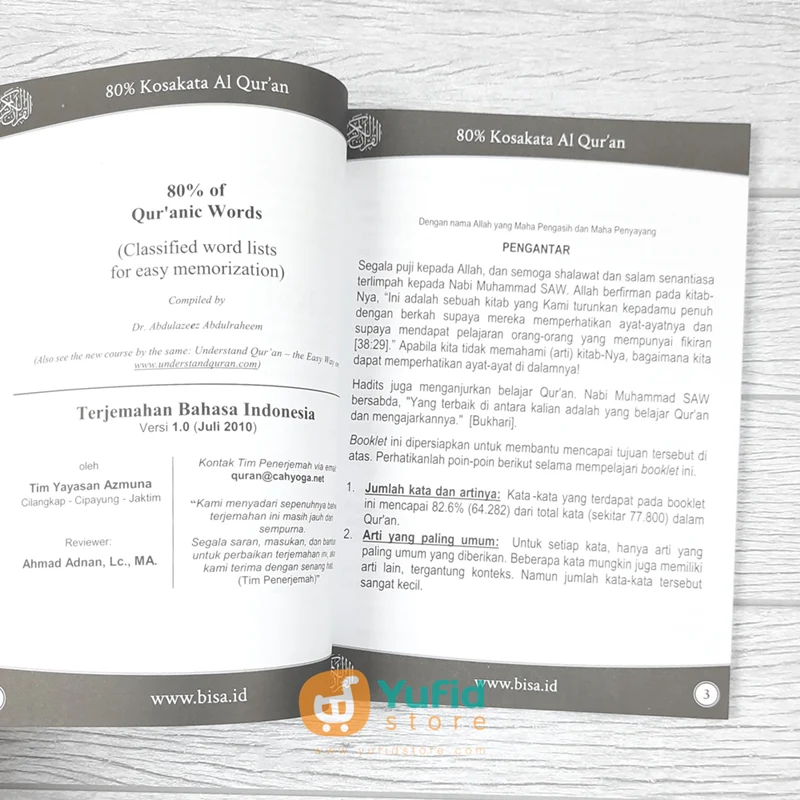 Memahami Al-Qur’an secara langsung tanpa terjemahan adalah impian setiap Muslim, namun sering kali terbentur keterbatasan kosakata. Padahal, bagaimana kita bisa merenungi ayat-ayat-Nya jika tidak memahami maknanya? Buku 80% Kosakata Al-Qur’an hadir sebagai solusi praktis untuk membantu umat Islam memahami isi Al-Qur’an dengan lebih mudah. Buku ini menyajikan daftar kata yang telah diklasifikasi untuk mempermudah hafalan, sehingga hanya dengan mempelajari 33 halaman dalam booklet ini, Anda sudah menguasai lebih dari 82% kosakata dalam Al-Qur’an!